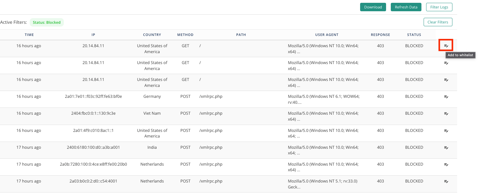 If you want to unblock any IPs on this list, Click on the Add to Whitelist Icon at the end of the row.